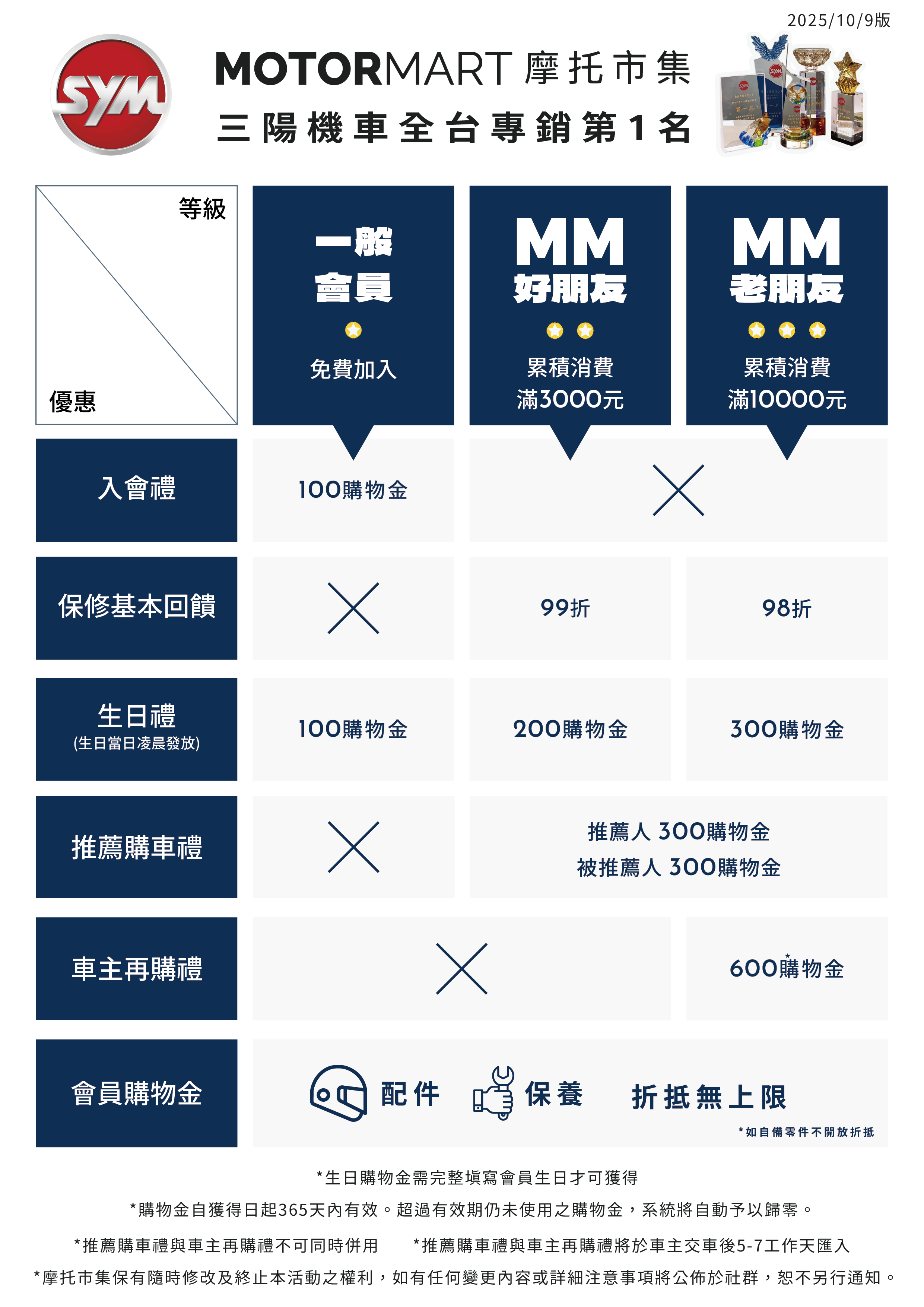 MotorMart摩托市集會員制度適用於本公司之實體門市,會員在前述通路指定消費內容均可累積消費和享有會員折扣。